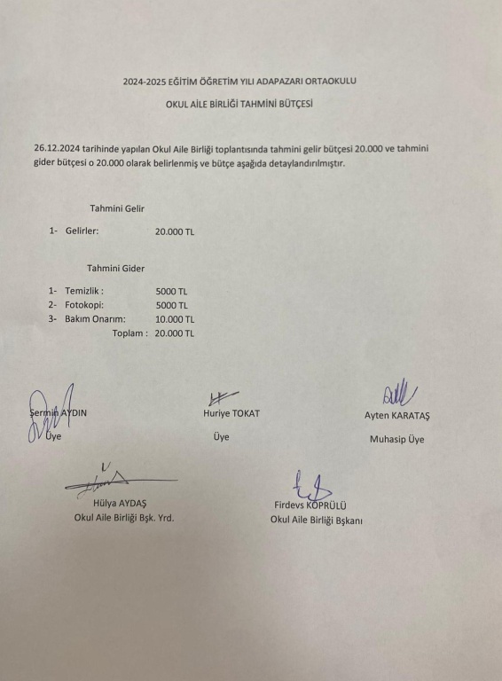 2024-2024 Eğitim Öğretim Yılı Okul Aile Birliği Tahmini Bütçemiz